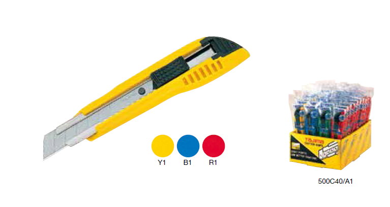 The ergonomic 18 mm cutter is equipped with two ENDURA blades and features an Auto Blade Lock for enhanced safety and precision. This heavy-duty cutter includes in-handle blade storage and comes with three Endura blades. It is available in single-color packs or as part of a 40-piece displayer with four color variations.